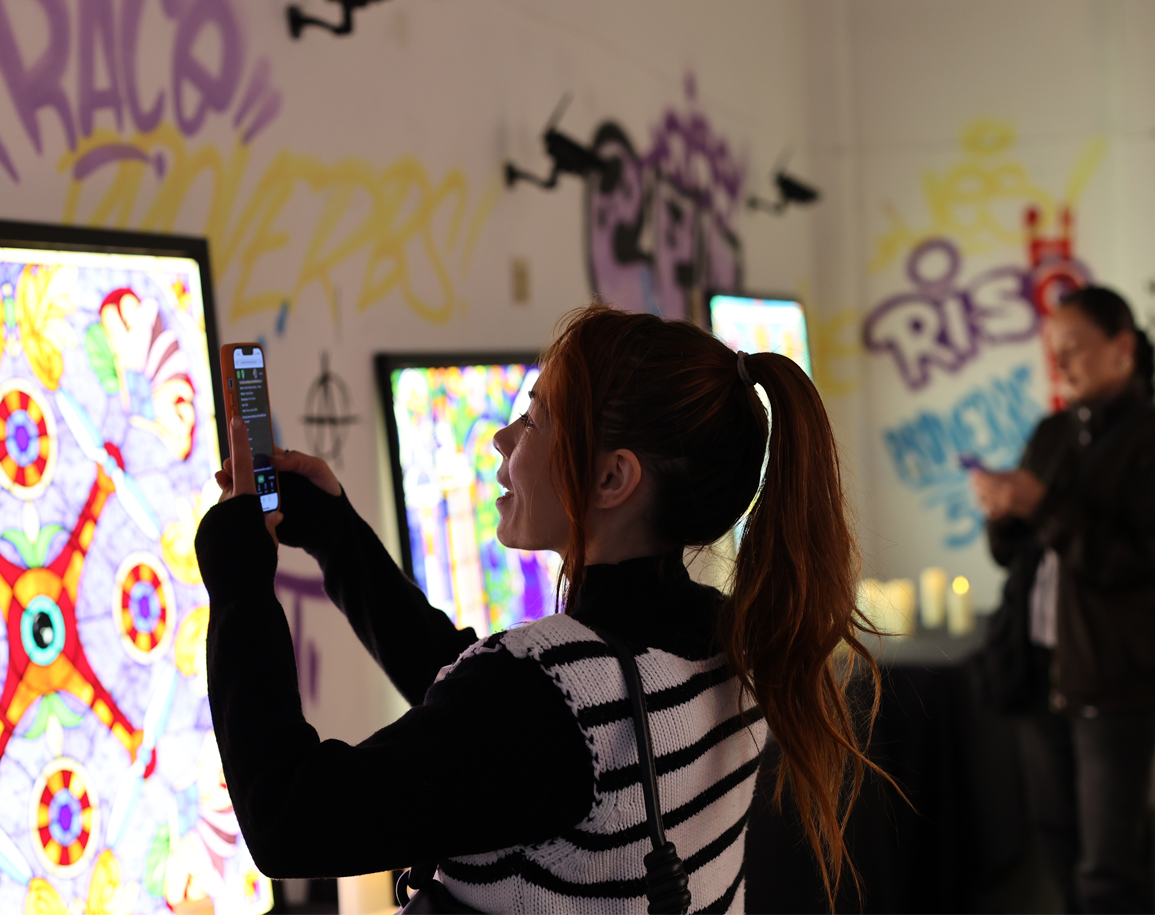 An immersive exhibition combining painting, sculpture, stained glass, augmented reality, AI, and sound. Guided by a custom app and its AI entity, LOGOS, the exhibition evolved through visitor participation, turning audiences into active participants in a living narrative.