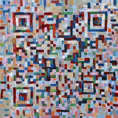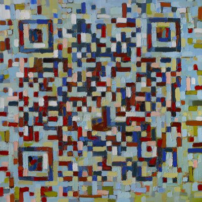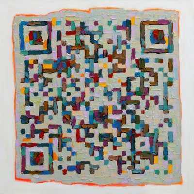 I wondered if I could create large QR paintings that could scan? I spent most of the year in the studio with a paint brush in one hand and my smartphone in the other as I’d have to scan the paintings after changes and additions to ensure they still ‘worked’. I also started incorporating 30% error correction into the codes so I could be quite creative with the application of thick, impasto paint.